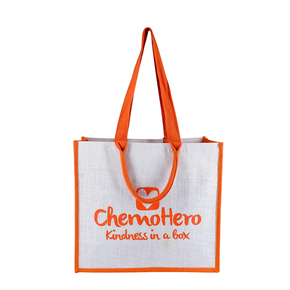 The GJ014 Large Jute Bag: crafted from high-quality lined jute in ChemoHero’s bright white and orange colours. Measuring 45cm x 40cm with an 18cm base, it offers ample space for hospital essentials. Its dual-handle system—soft padded cotton handles and longer flat webbed handles—ensures flexibility and comfort for patients, whether carried by hand or over the shoulder.