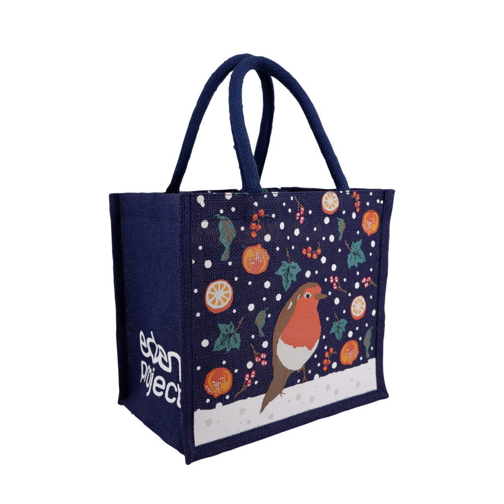 We also created a Bespoke Corn Starch Coated Small Jute Bag, printed and handmade in India, to Eden’s specific requirements. This compact design, measuring 27cm wide by 24cm high with a 17cm depth, features quality coated jute fabric with a 14/15 weave and luxury padded handles made from soft cotton.